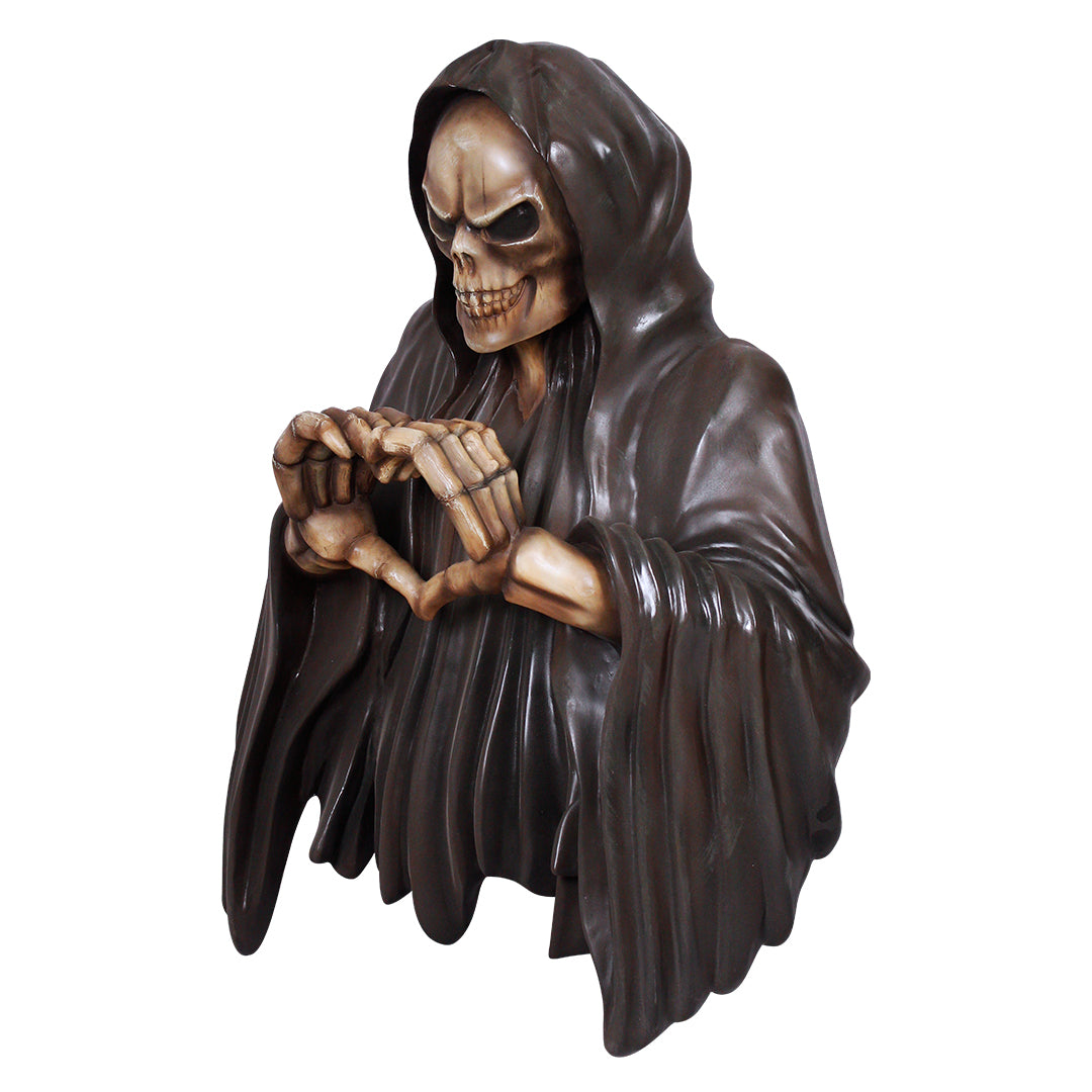 Create a spectacular Halloween display for your visitors with this skeleton statue with a heart hand sign. This spooky decor is sculpted and painted in the finest detail for a realistic look. It is made of durable fiberglass resin that can withstand any weather, making it an ideal display for any indoor and outdoor environment.